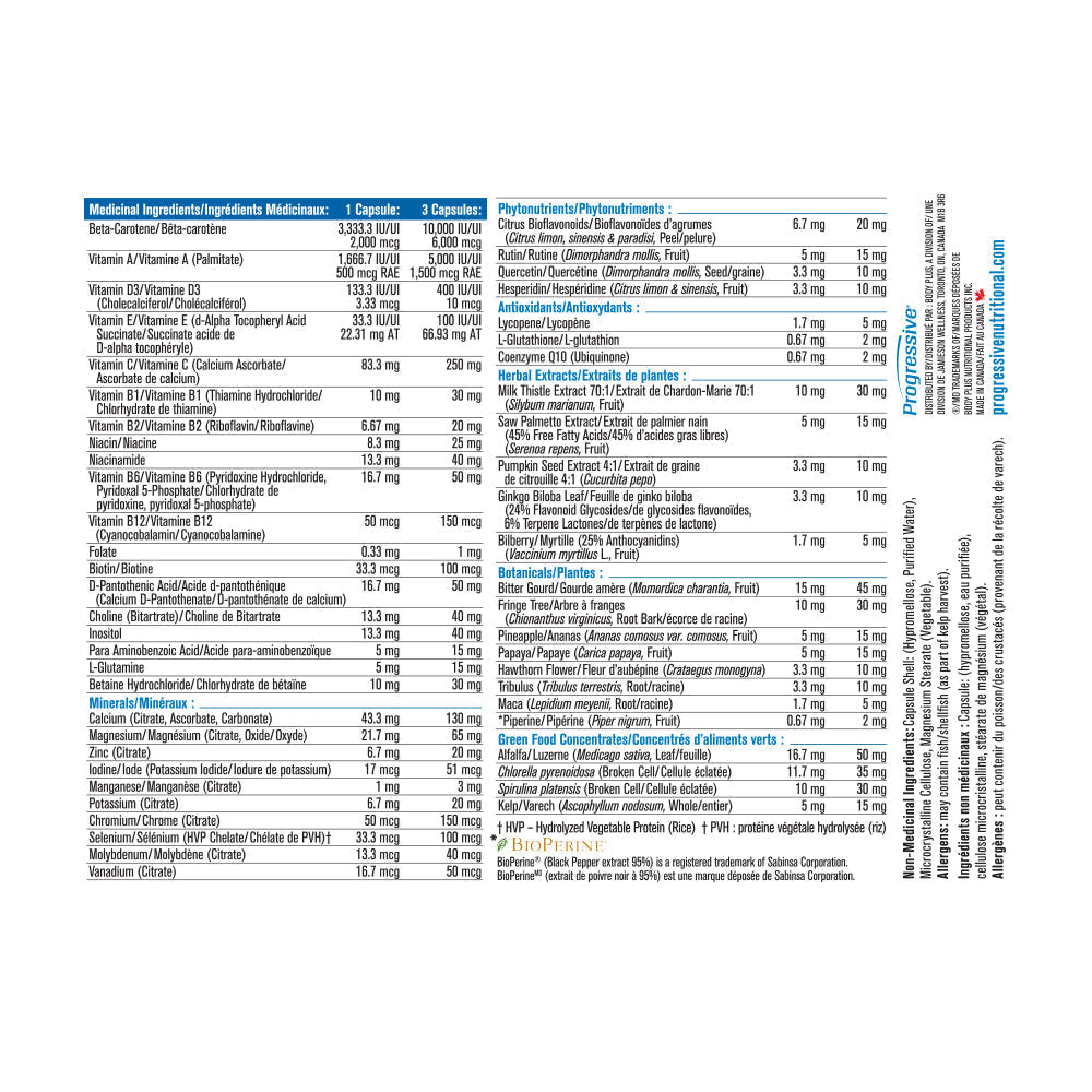 PROGRESSIVE - Multi Men 50+ - 60 Capsule(s) - NPN: 80036514 -- Progressive MultiVitamin Men 50+ is a unique formula designed to meet the specific needs for vitamins, minerals and other essential nutrients for men over 50. A 'one size fits all' Multivitamin Formula, taken once a day, cannot possibly satisfy all of your varied nutritional needs. Progressive knows the specific needs of each individual and has created 8 different formulas based on age. gender and activity level. Getting older is no reason to slow down. Progressive Multivitamins for Men 50+ addresses the needs of an againg body and helps you to stay youthful and active. Progressive MultiVitamin - Men 50+ is not simply another multi vitamin. It specifically meets the needs of men over 50.